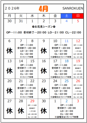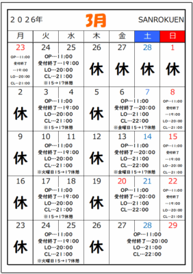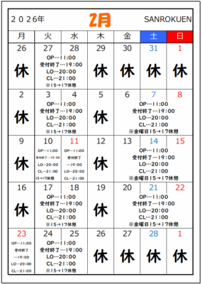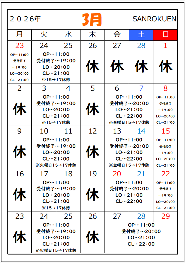 ※振替・臨時休業がございますので、ご来店の際には必ずお電話もしくは【ぐるなび】ネット予約にてご予約お願いします。