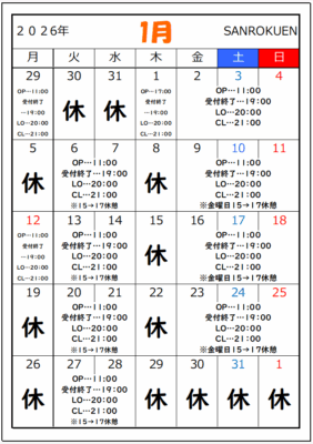 ※振替・臨時休業がございますので、ご来店の際には必ずお電話もしくは【ぐるなび】ネット予約にてご予約お願いします。
