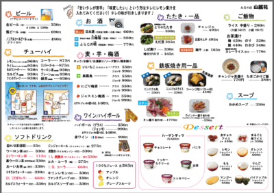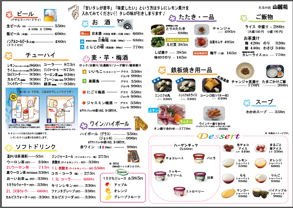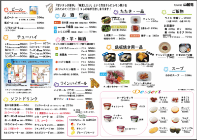 | ●ビール(スーパードライ) ●チューハイ ●焼酎 ●赤ワイン ●梅酒 ●日本酒(かん酒・冷酒) ●ノンアルコールビール&ソフトドリンク各種ご用意しております。 |